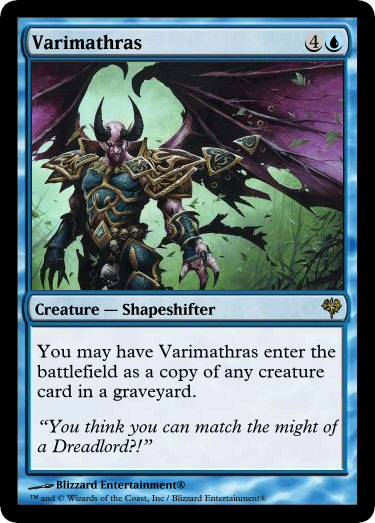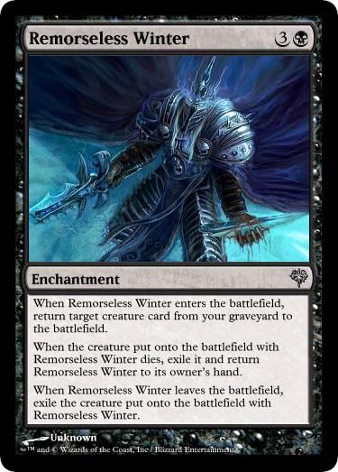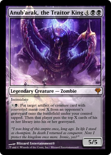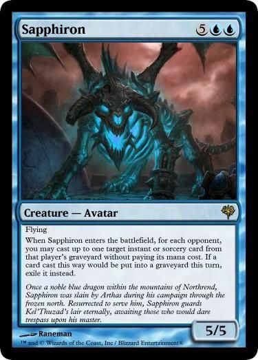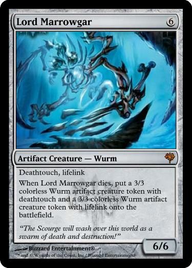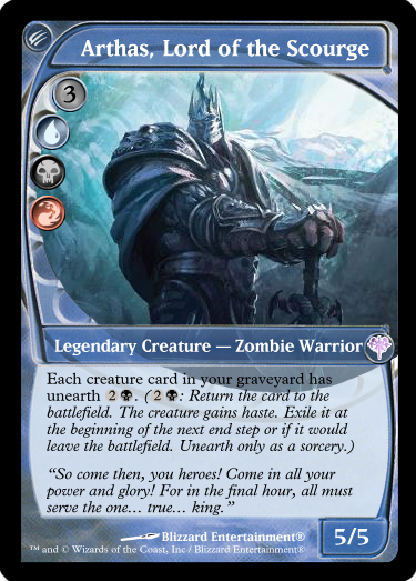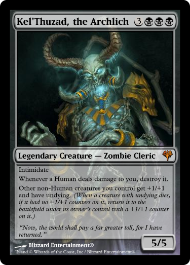 I'm in the planning stages of my next EDH deck. So I decided the subject matter is going to be based on Warcraft Lore. I picked my favorite character, Arthas, and will be building a deck around his time as the Lich King of the Scourge. The art will all be subject to change, and the cards are all official Magic: the Gathering cards. The reason I kept certain creatures subtypes is because some cards may reference them, so I did not want to disturb the natural balance of the game or format.